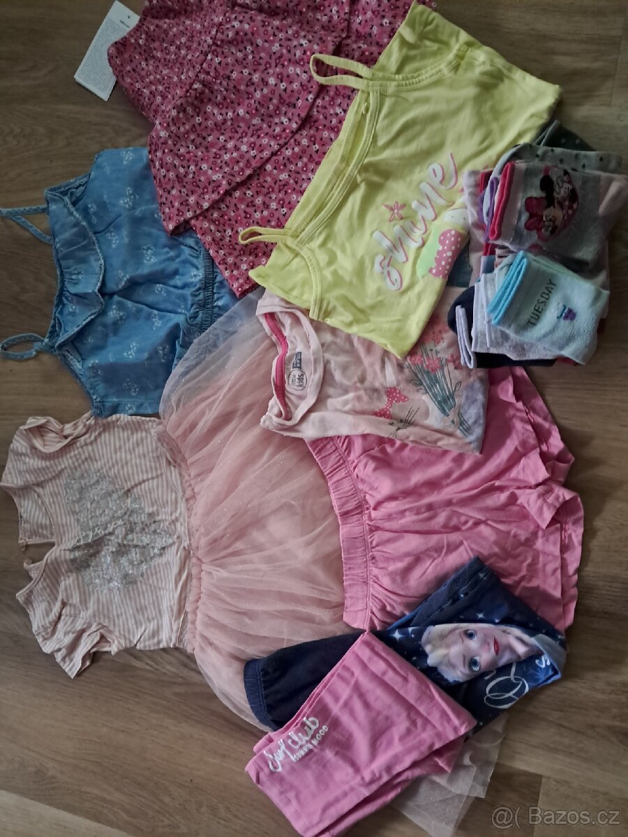 Šaty růžové s nadýchanou tylovou sukničkou, která je zdobená flitry. Modré šaty na ramínka s bílými mašličkami. Sukně růžová s barevnými kytičkami.Triko kr.rukav, tílko žluté, růžové kraťasy a 3/4 elasťáky,leginy s Elsou.