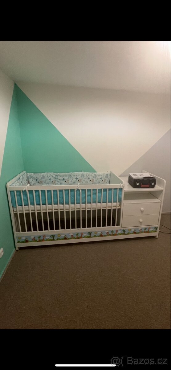 Prodám dětskou postýlku s přebalovacím pultem, později lze udělat dětskou postel. Nese známky užívání viz. Foto. Již kupované z druhé ruky - fleky na přebalovacím pultu a vylomené dřevo u “šprucle” už bylo. Za dobu užívání se nijak nerozšířilo ani nevylomilo znovu. Samolepka se zvířátky lze odlepit. Mohu přidat dětskou kokosovou matraci 140x70, chránič matrace a 2x prostěradlo. CENU NABIDNETE