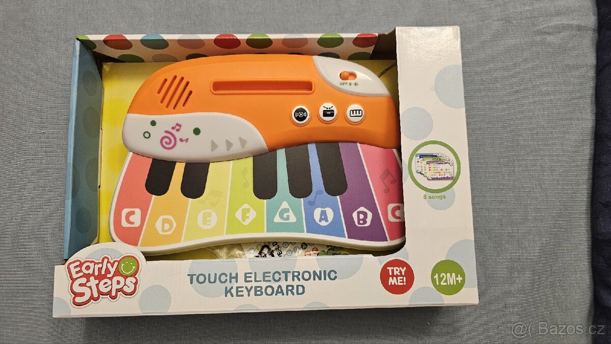 Prodám elektronické hrající piano pro děti, vhodné od 12 měsíců. Úplně nové, nerozbalené, nepoužité. Osm písniček. Svítí a bliká. Dvě úrovně hlasitosti. Tři módy. Osm kláves. Na baterie (3x AAA). Stojánek na kartičky (kartičky pro melodie součástí balení).