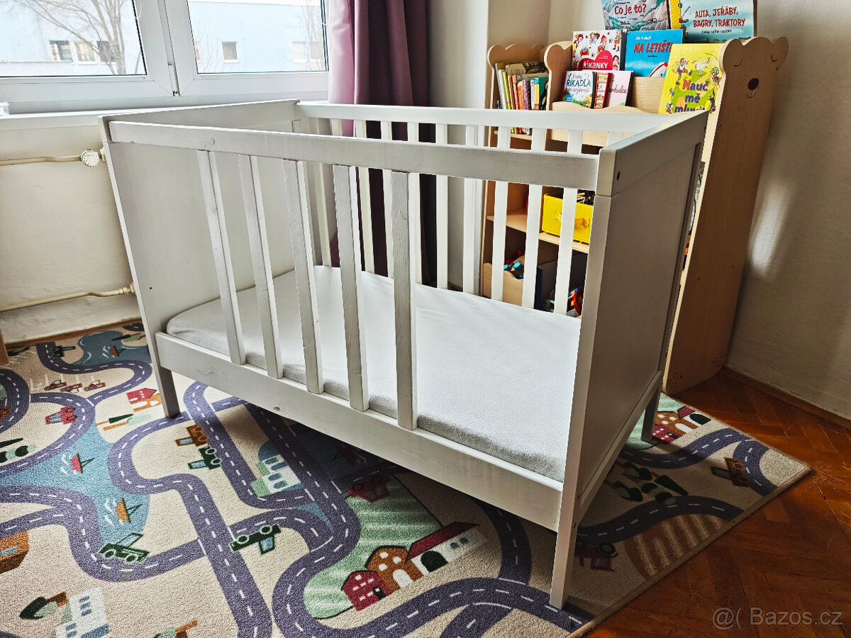 Dětská postýlka IKEA Sundvik, bílá, rozměry 60x120 cm. Cena včetně matrace a potahu. Na matraci celou dobu používán chránič. K postýlce zdarma přidám druhou bočnici umožňující snadné vylézání (viz obr).