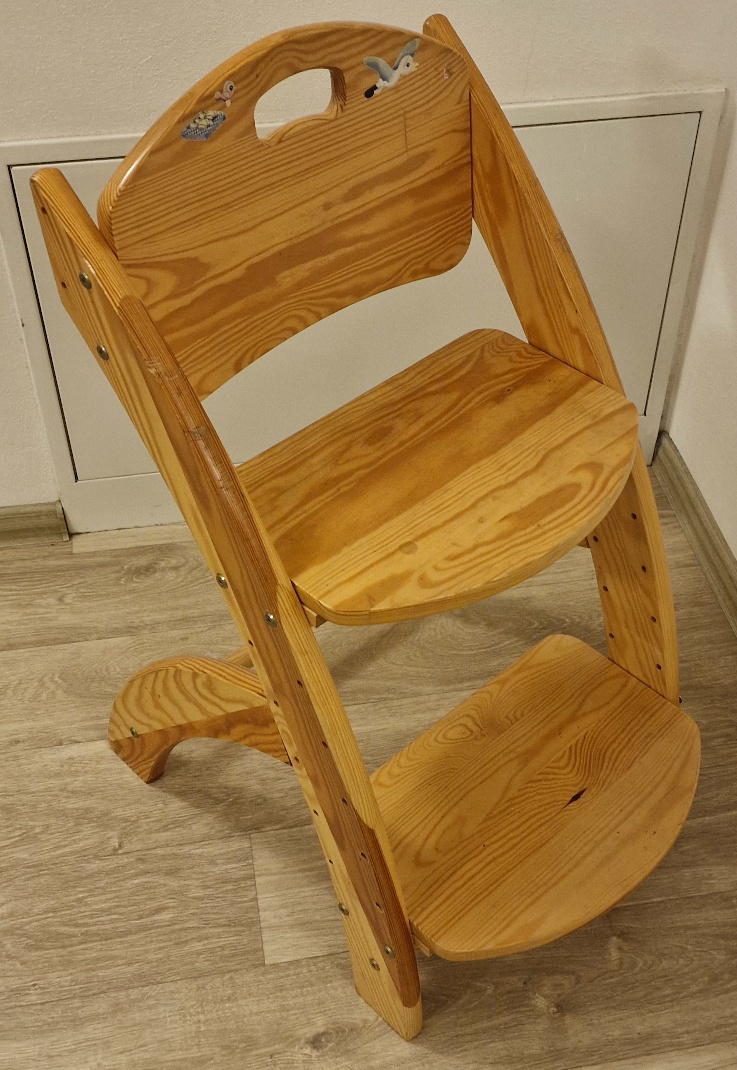 Zachovalá dětská židle vhodná do jídelny nebo k psacímu stolu. Nálepky jsou odstraněny.