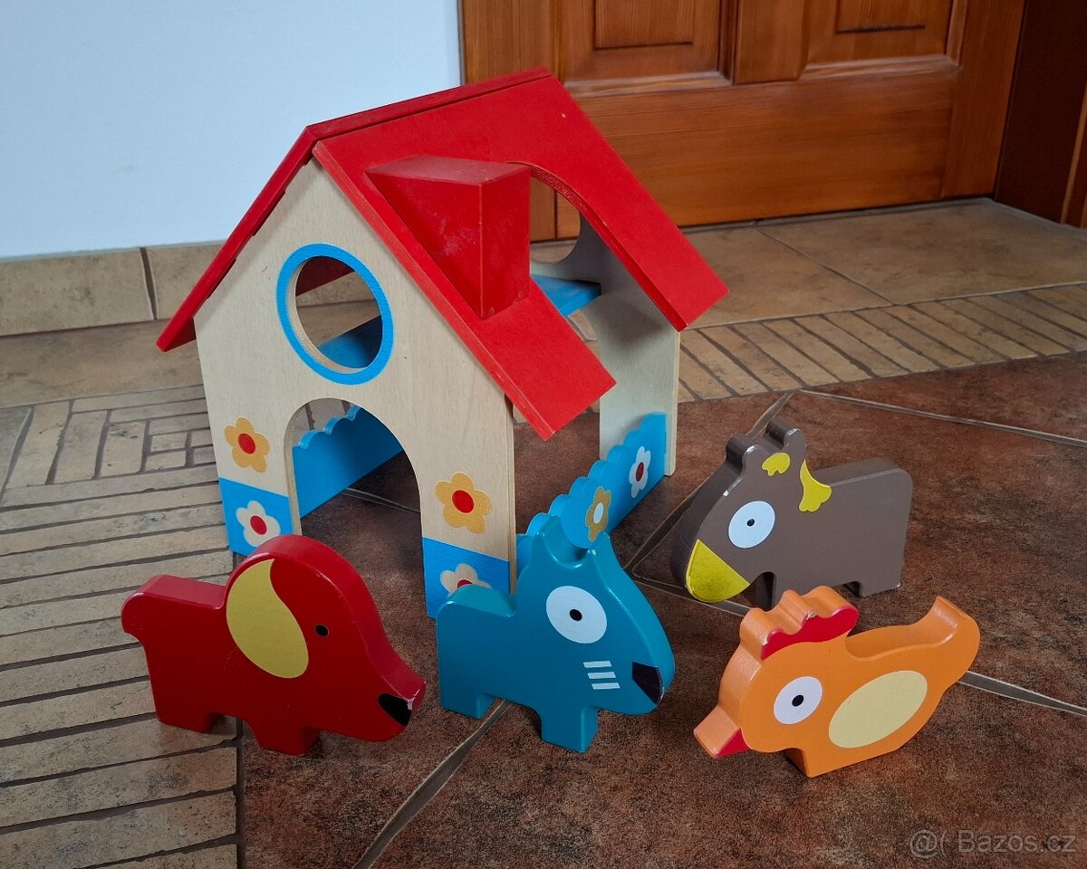 Prodám dřevěný domeček se zvířátky. Domeček v perfektnim stavu. Nelze rozebrat - nedržel pohromadě, takže je slepený. Zvířátka mají oťukané hrany.