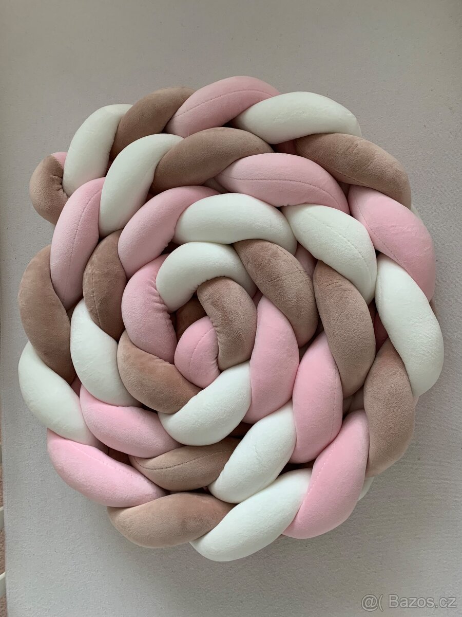 Nový mantinel cop ze 100% bavlny do dětské postýlky. Příjemný měkkoučký bavlněný mikroplyš plněný dutým vláknem, kombinace 3 barev, 1 cop bílý, 1 cop světle růžový a 1 cop starorůžový až béžový. Délka copu 3 metry, pokryje 3 strany postýlky, foceno ve větší postýlce, než je standardní velikost ( tato postýlka má 125x65cm). Výška 11 cm. Vhodné také jako mantinel kolem miminka místo hnízdečka či kolem něj, dostatečná délka zaručuje použití i pro větší miminka, nejen novorozence. Zároveň lze použít jako mantinel na větší dětskou postel jako zábrana i jako polštář.