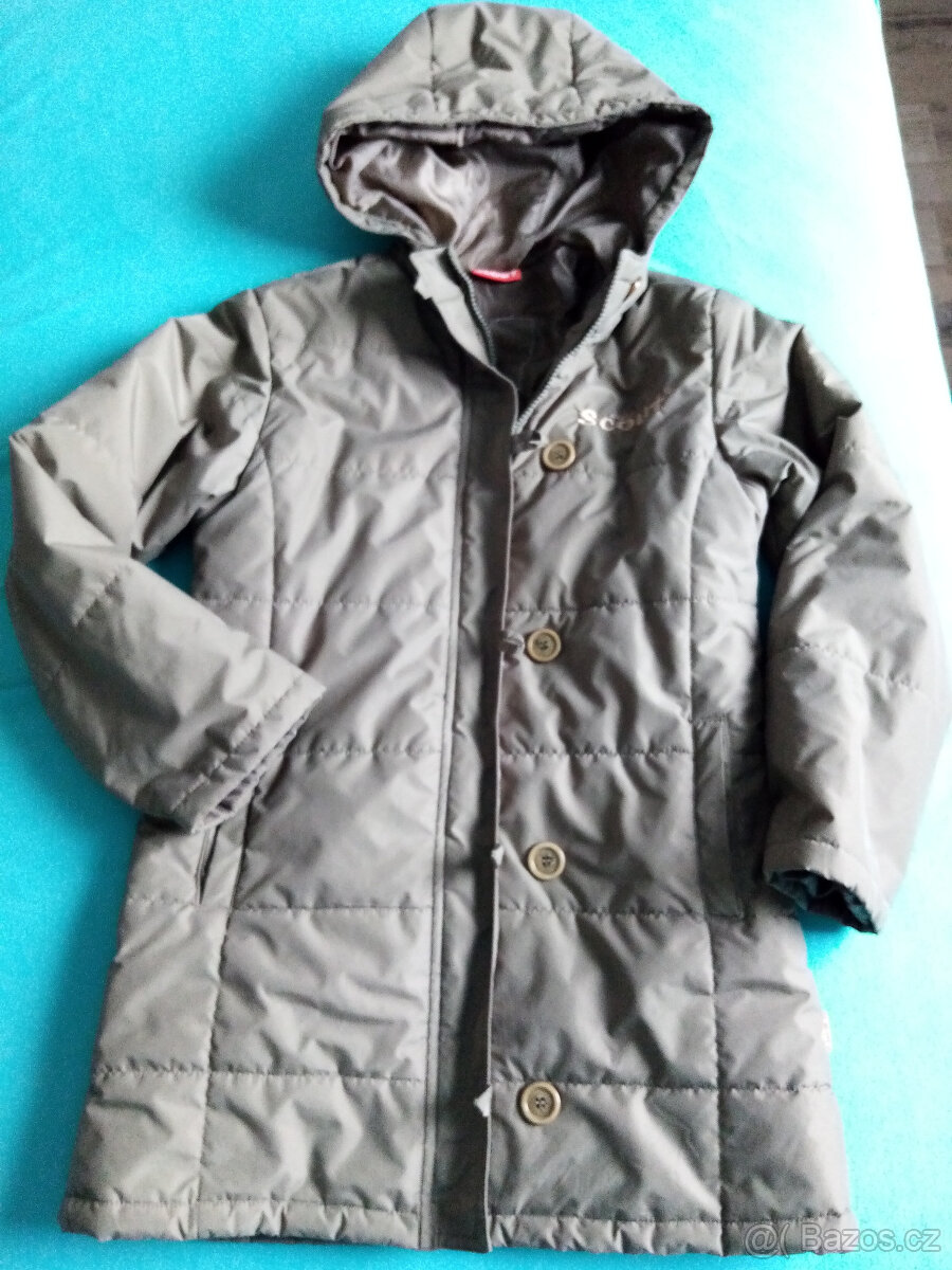 Prodam detskou, divci bundu, kabat, SCOUT, vel.140. Khaki barva. Nosena, neznicena - je opraveny jezdec - viz foto - jinak bez fleků, plne funkcni, tepla.