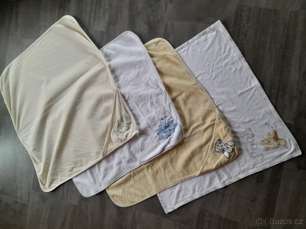 Prodám tři ručníky s kapucou pro miminko (2x žlutý, 1x bílý) a jednu bílou dečku medvídek Pú. 50kč/ks.