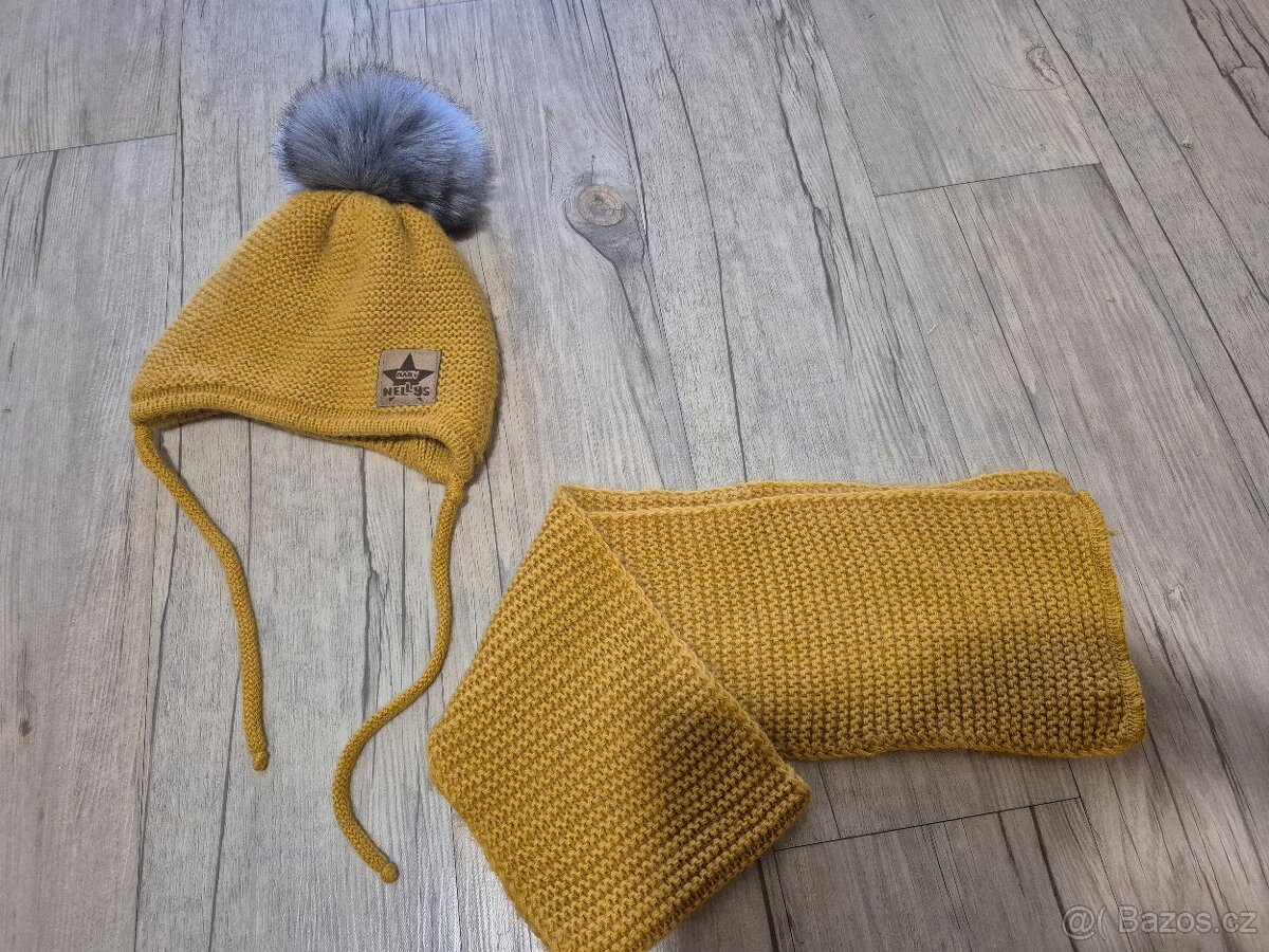 Krásná zimní čepice a šála v hořčicové barvě po jednom dítěti. Kupované nové.