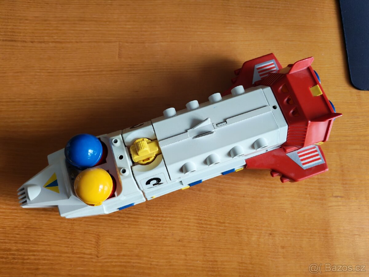 Kolečka vespod. Jeřáb uvnitř. Vozítko. Dva panáčci. Raketoplán lze rozdělit na 3 části. Klasika z NDR.