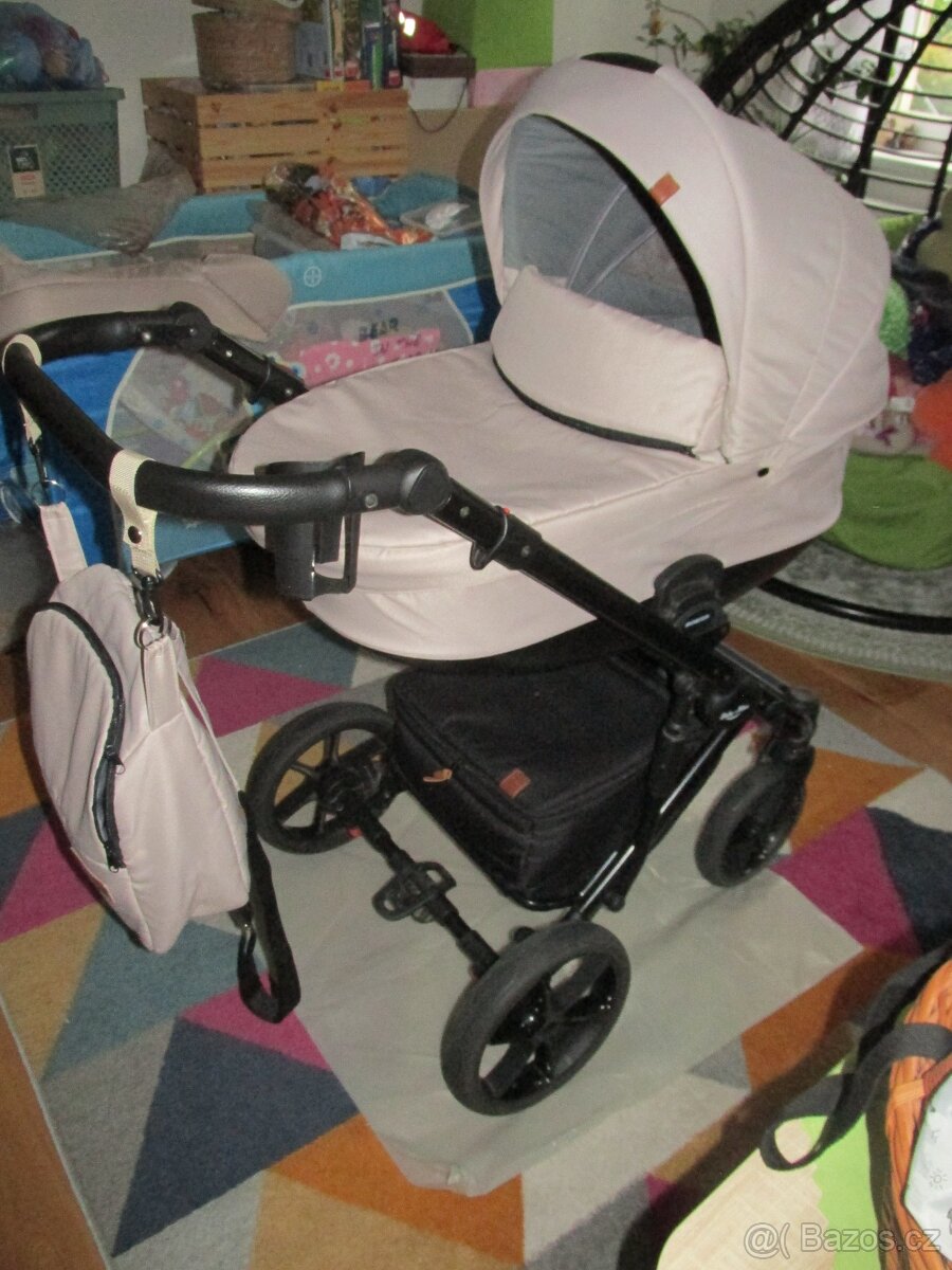 Nabízím kombinovaný kočárek značky Baby Merc evolutions v krémově - černé kombinaci barev. Konstrukce je snadno složitelná a nezabere mnoho místa. Na konstrukci je přidělaný praktický košík na zip. Kolečka bezúdržbová gelová, přední s aretací. Součástí kočárku je konstrukce s kolečky, hluboká polohovatelná korbička s matrací a polštářkem v šedé barvě, sportovní nástavba také polohovatelná s pětibodovými pásy a s nánožníkem a dále pak autosedačka (vajíčko) značky Joie s pětibodovými pásy. Dalším příslušenstvím ke kočárku jsou adaptéry na autosedačku, pláštěnka na autosedačku a univerzální pláštěnka na obě verze kočárku, síťka proti hmyzu v černé barvě, držák na pití a přebalovací batůžek s podložkou na přebalování. Kočárek i autosedačka mají potahy odnímatelné a v případě potřeby je lze vyprat na nízký stupeň praní - vše čisté, vyprané. Kočárek i autosedačka v pěkném stavu. Všechny prvky se dají vozit po i proti směru jízdy.