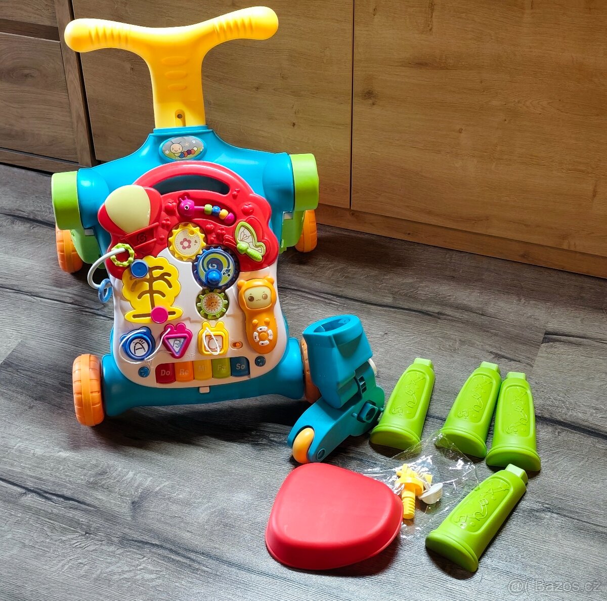 Úplně nové, použili jsme jen samotný interaktivní panel a zavěsili na postýlku. Lze sestavit chodítko, koloběžka, stoleček, odrážedlo nebo samotný panel.