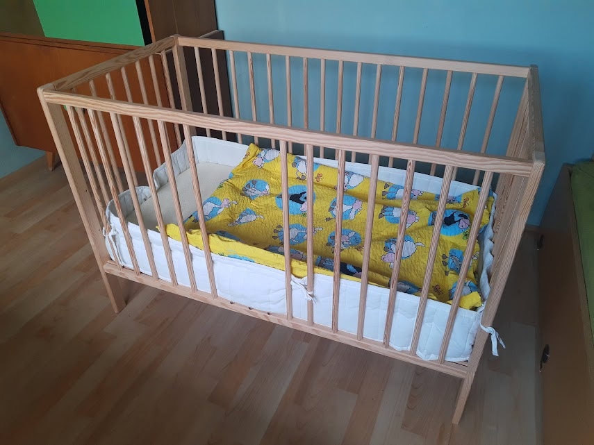Prodám velmi málo používanou dětskou dřevěnou postýlku 120 x 60 cm - přírodní, masiv buk, 3 vyndávací příčky, 2 polohy roštu + matrace vč.froté prostěradla a chrániče + peřinka s povlečením.