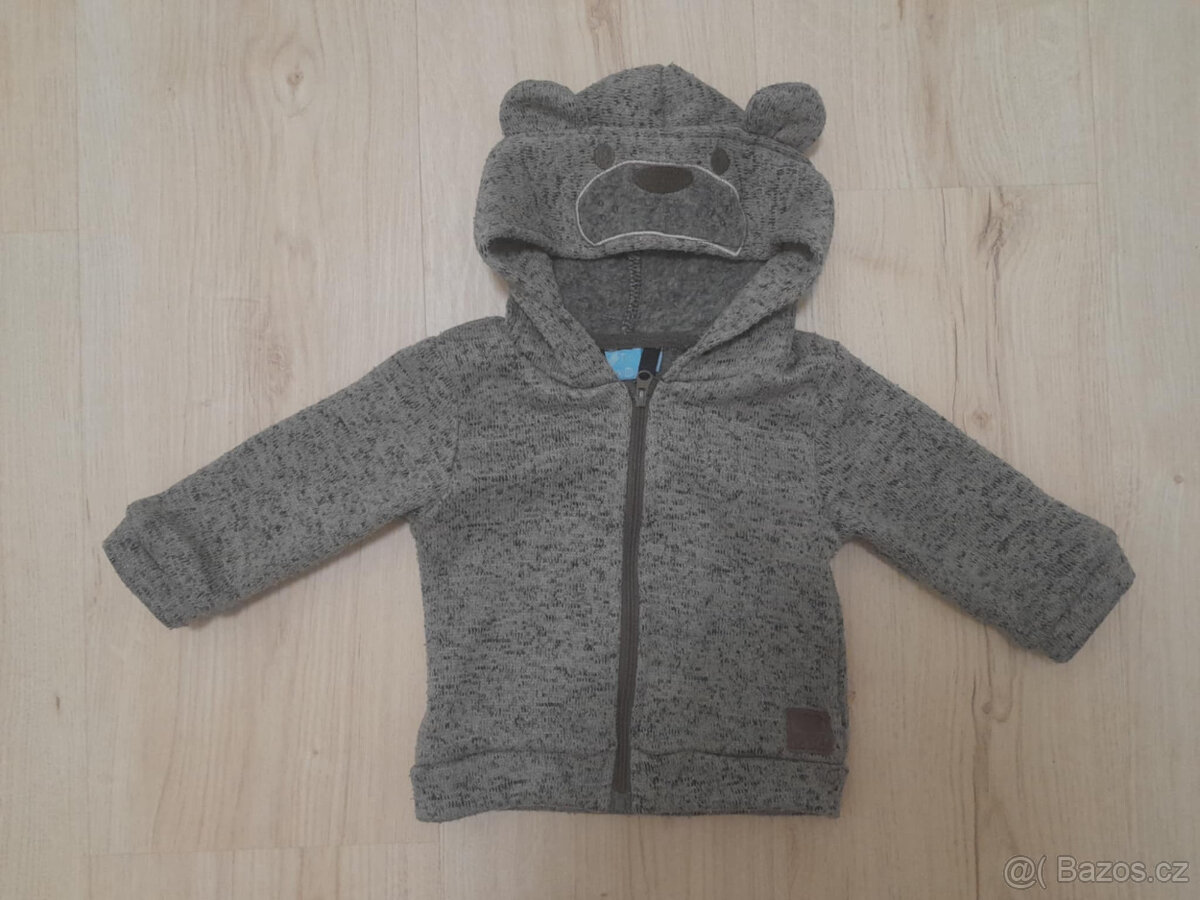 Tři mikiny vel. 86 - [11.2. 2026]Jedna mikina je hnědá s kapucí a zipem a dost teplá, druhá pruhovaná tenká bavlněná s kapucí a zipem a třetí nenošená bavlněná přes hlavu a bez kapuce s obrázky mickey mouse.