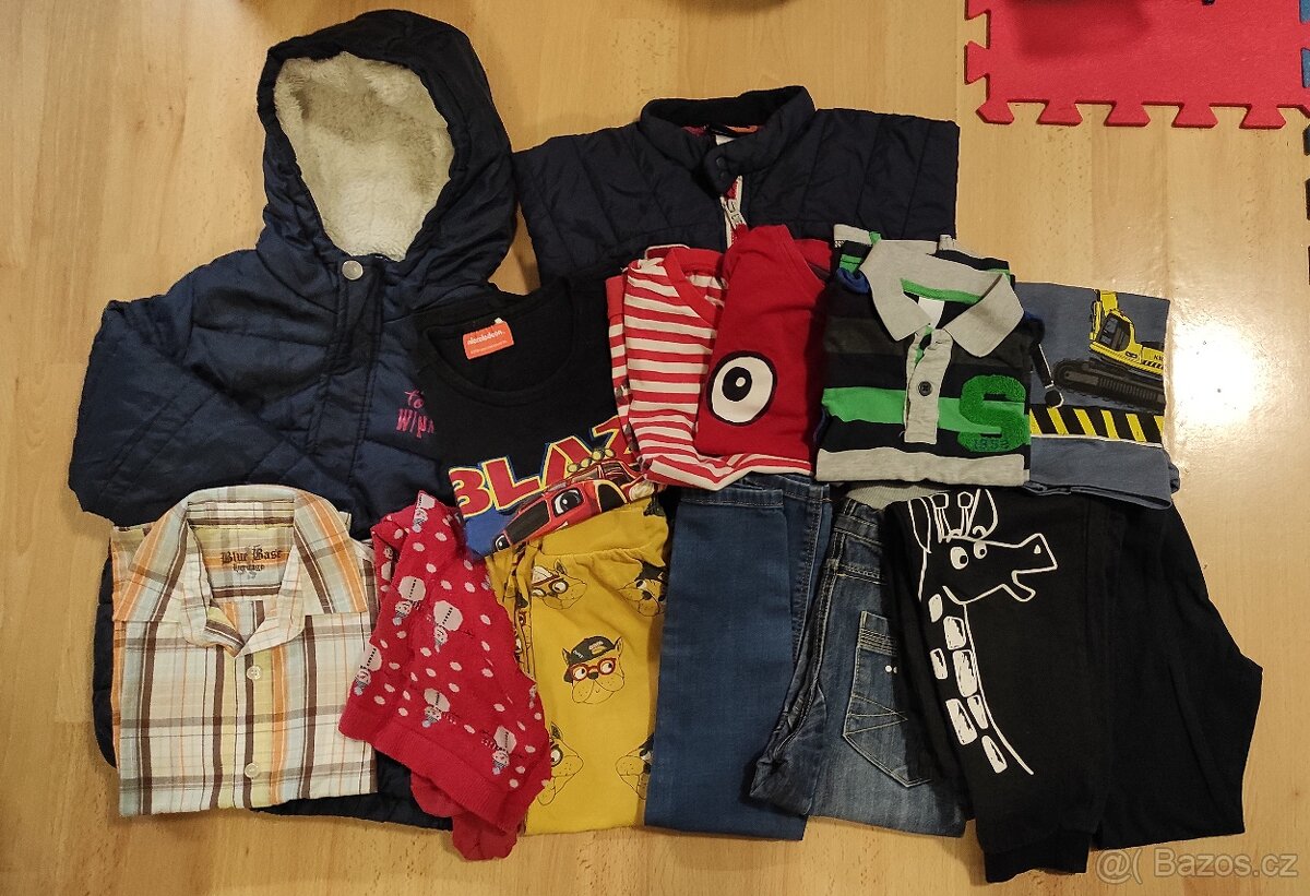 Prodám set oblečení pro nenáročnou maminku, většina ve velikosti 110, 110-116 a 116 (nebo srovnatelně velké). Set se skládá ze dvou zimních bund (tenčí Didriksons 110 a silnější Lupilu 116), triček, kalhot, tepláků, legín a termopunčocháčů. Značky různé. Motivy: Plamínek, jeřáb... Dobrý stav (žmolek, obrázek jeřábu popraskaný...). Slabší bunda má dírku, tepláky s pejsky s flíčky, kolena světlejší... Nevylučuji, že jsem něco přehlédla.