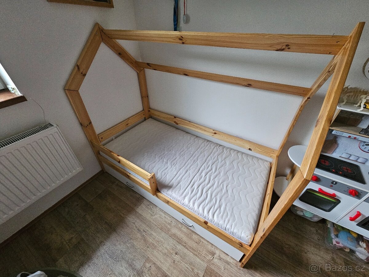 Dětská postel 140x70 + doplňky - [8.2. 2026]Prodám dětskou domečkovou postel vč. doplňků. Rozměry matrace 140x70. Včetně matrace (mohu přidat 2x povlečení, chránič matrace). 4x úložný box pod postel Ikea. Domečková konstrukce kupovaná - materiál masiv BUK. Spodek dělaný na míru. Vše lze pro př ...