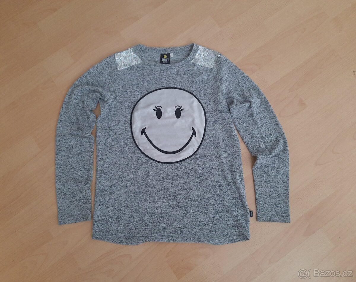 Tenký svetřík zn. Smiley World párkrát na sobě v pěkném stavu. Velikost na cedulce je 170-176. Délka 62-66 cm, průramky 48 cm, rukáv od krku 69 cm. Smajlík je látka a na ramenou flitry.