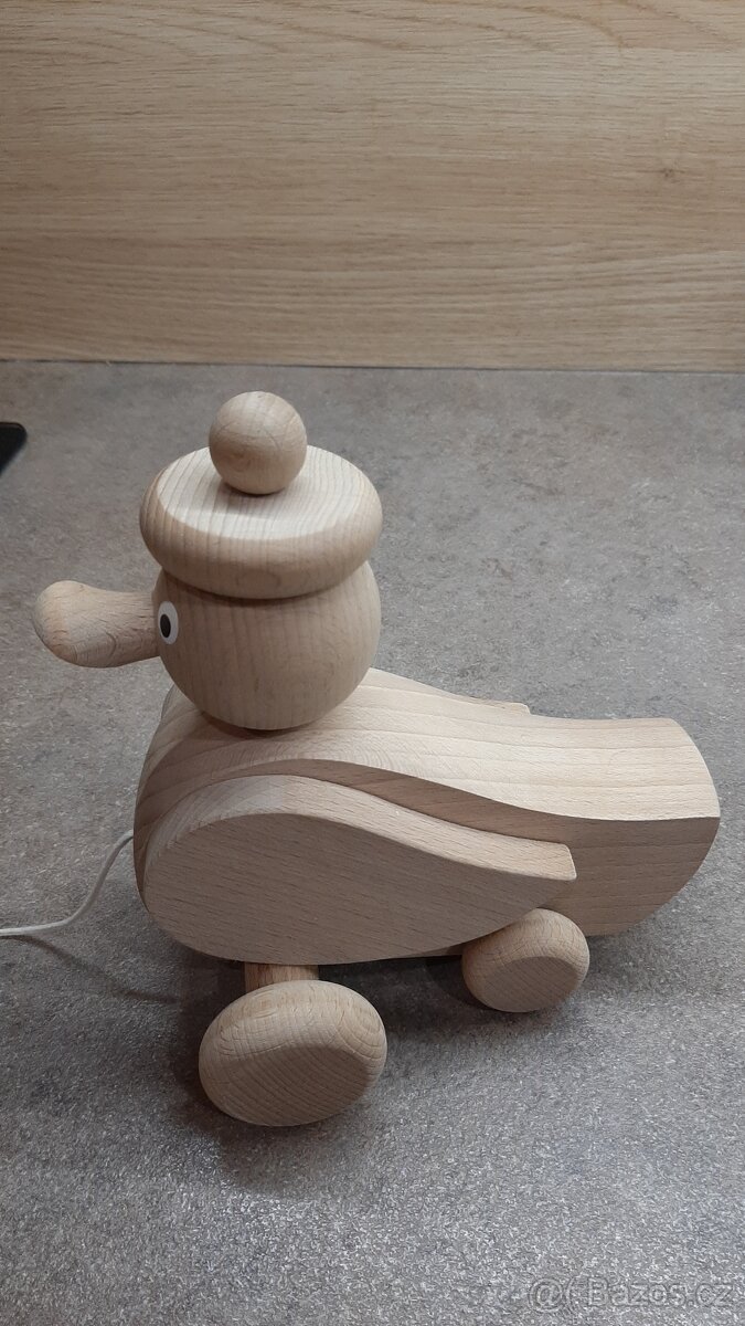 Prodám nového dřevěného kačera. Taháním jezdí po kolečkách a kýve hlavou.