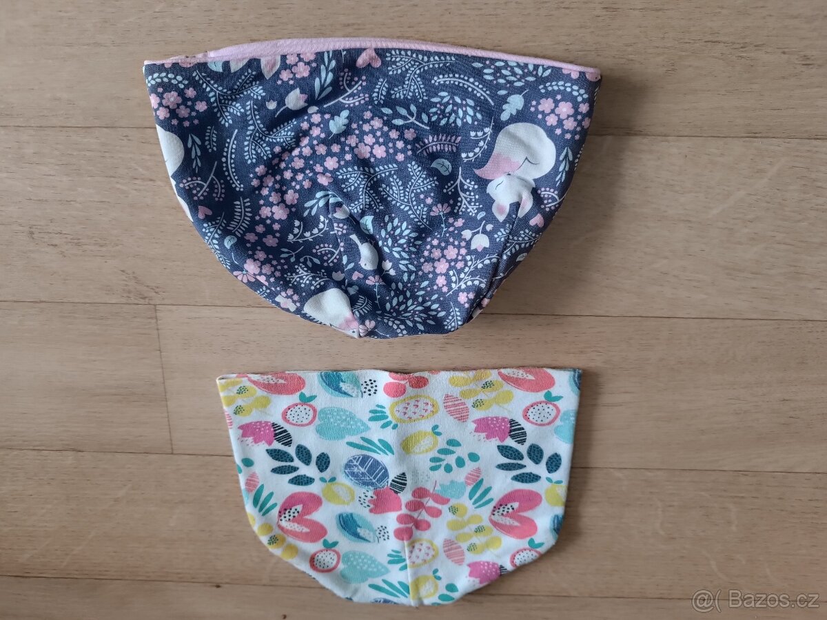 Dvě bavlněné čepice na podzim/jaro, nošené. Jedná je oboustranná - na straně se zvířátky má na lišce flek, ale ve vzoru není poznat. Míry viz foto, dcera nosila ve věku kolem 2/3 let. Cena za obě dohromady.