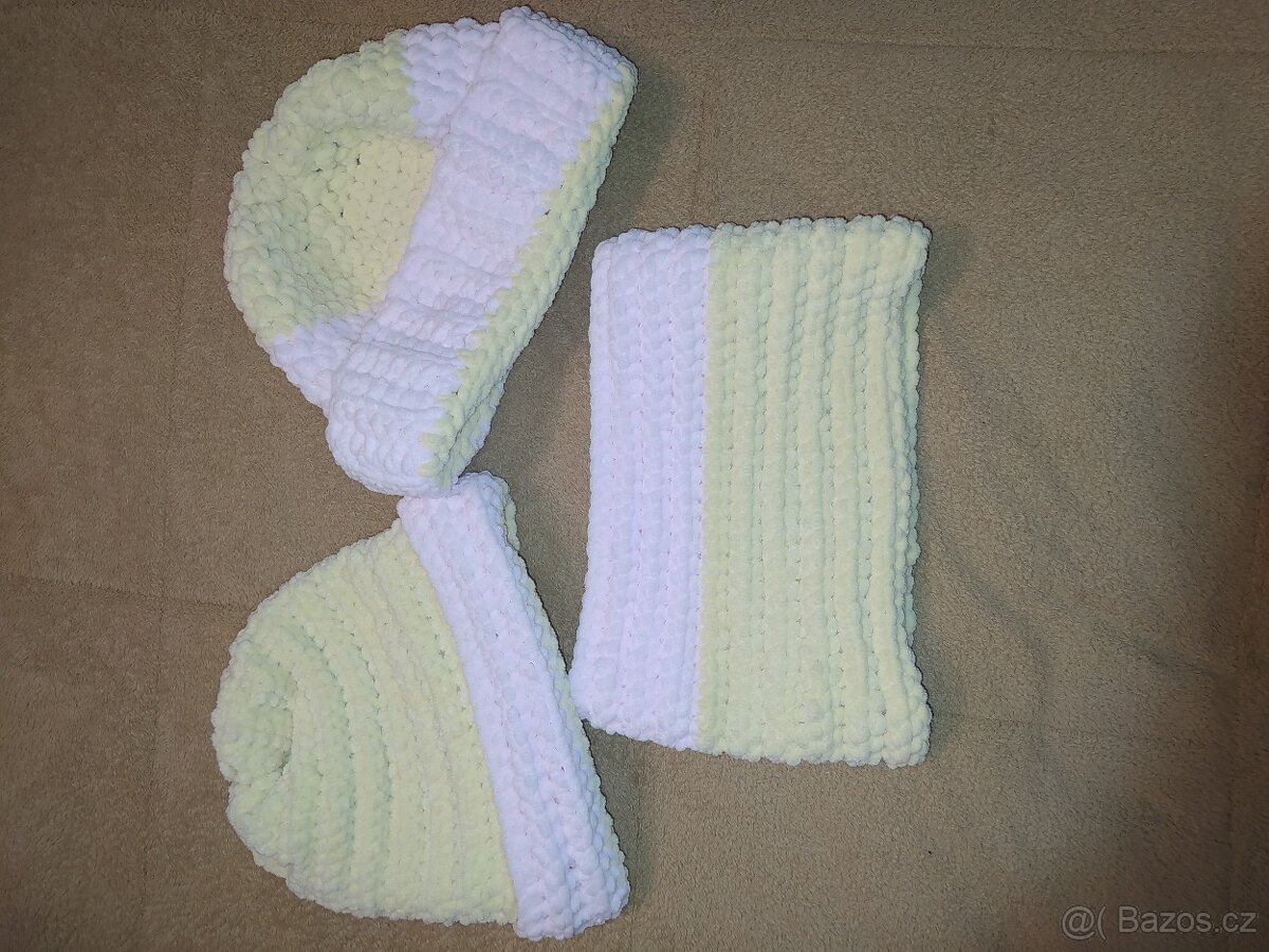 Pletené čepice s nákrčníkem, jedna má obvod 47cm, druhá 49cm. Příjemný materiál.