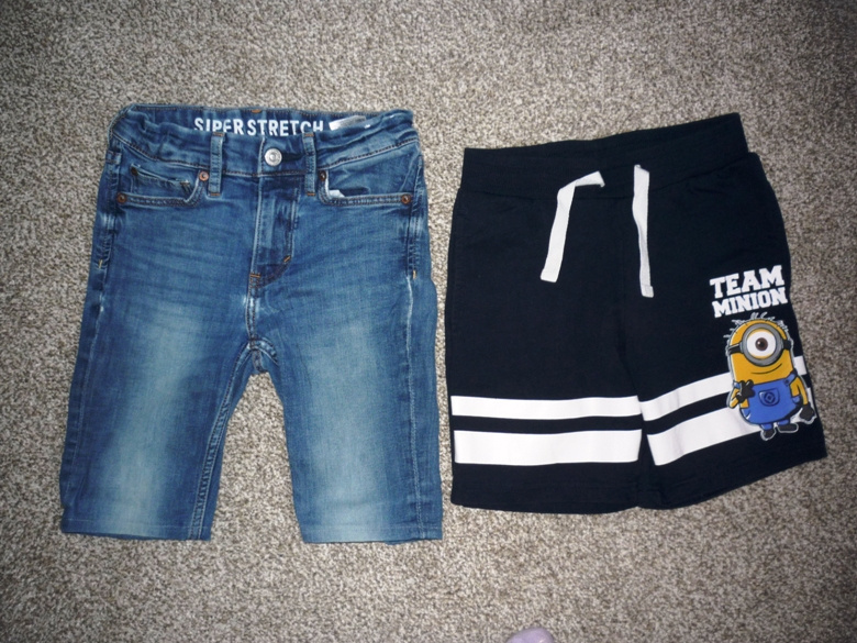 Džínové (nošenější) a balvněné kraťasy vel 134 (velmi dobrý stav), cena za oboje