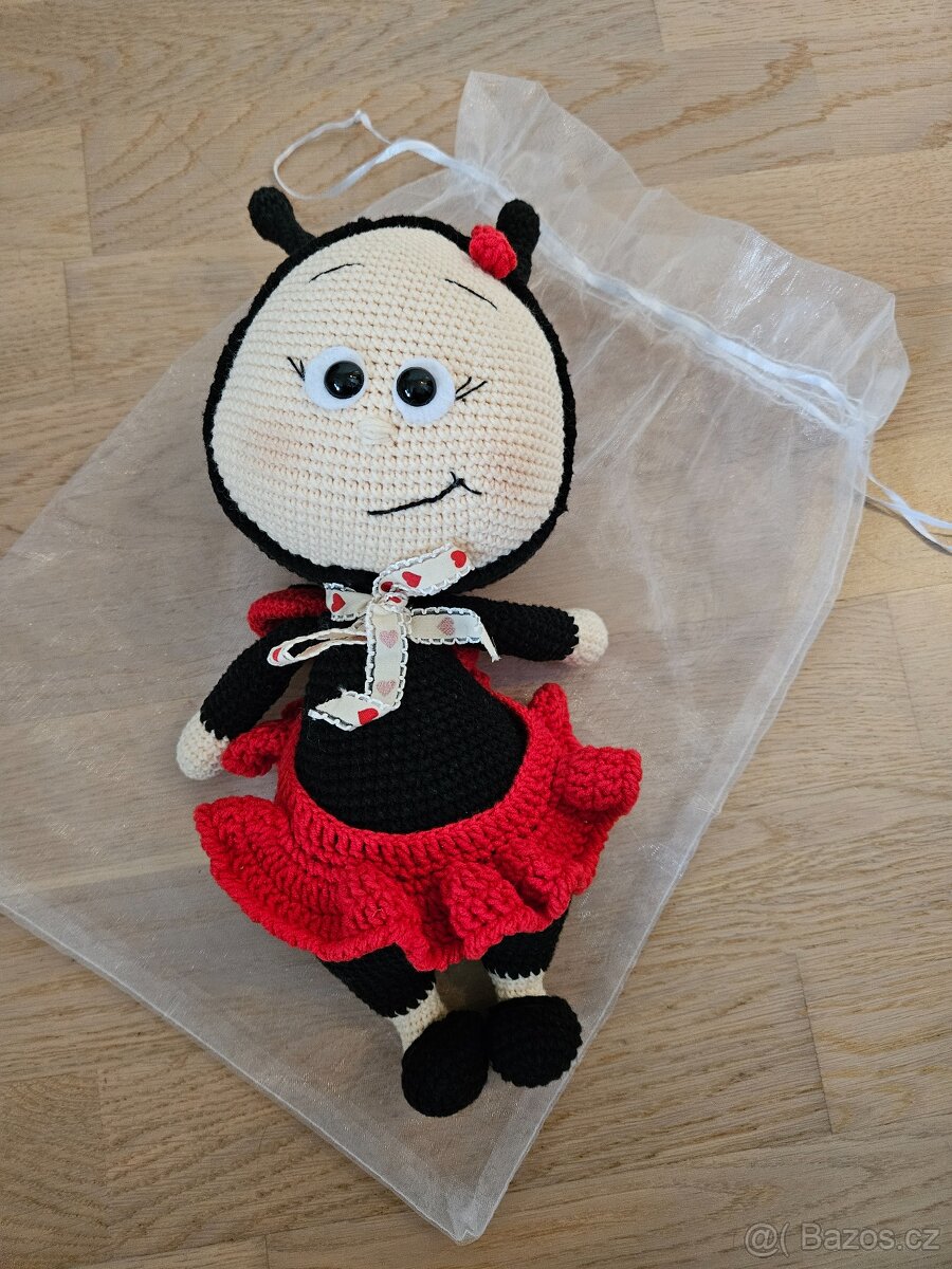 nová nepoužívaná háčkovaná hračka beruška, byla pouze chvilku vystavená na poličce, původní cena 1290,- Kč, sukýnku a botičky lze sundat, výška cca 30 cm + tykadla 6 cm, včetně obalu
