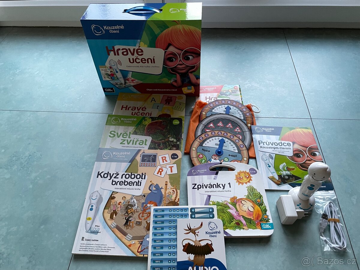 Hravé učení - základní set s elektronickou tužkou a knihou Hravé učení + Hra do auta, Audio blok (MP3 přehrávač), Zpívánky, Svět zvířat, Když roboti brebentí. Vše funkční a nepoškozeno.