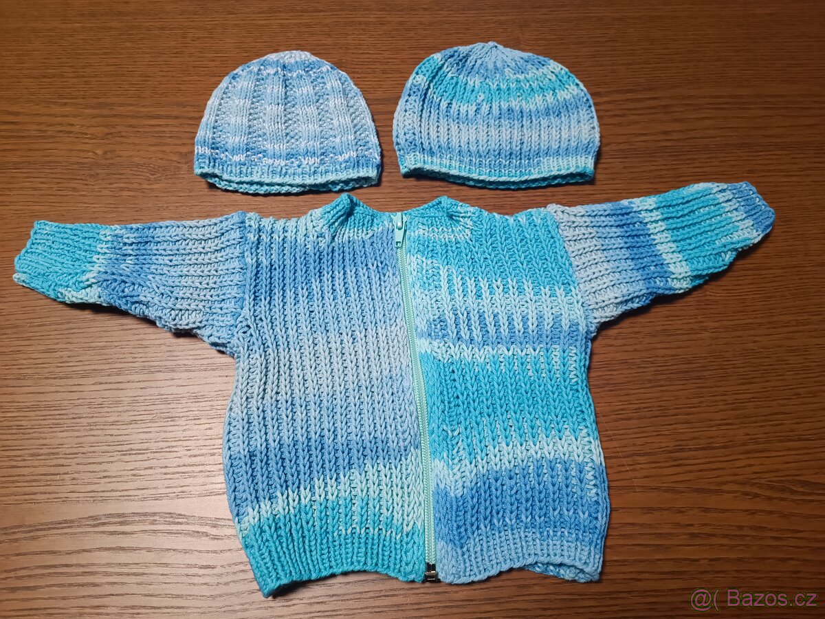 Mamka prodává svetřík a dvě čepičky na novorozence. Homemade.