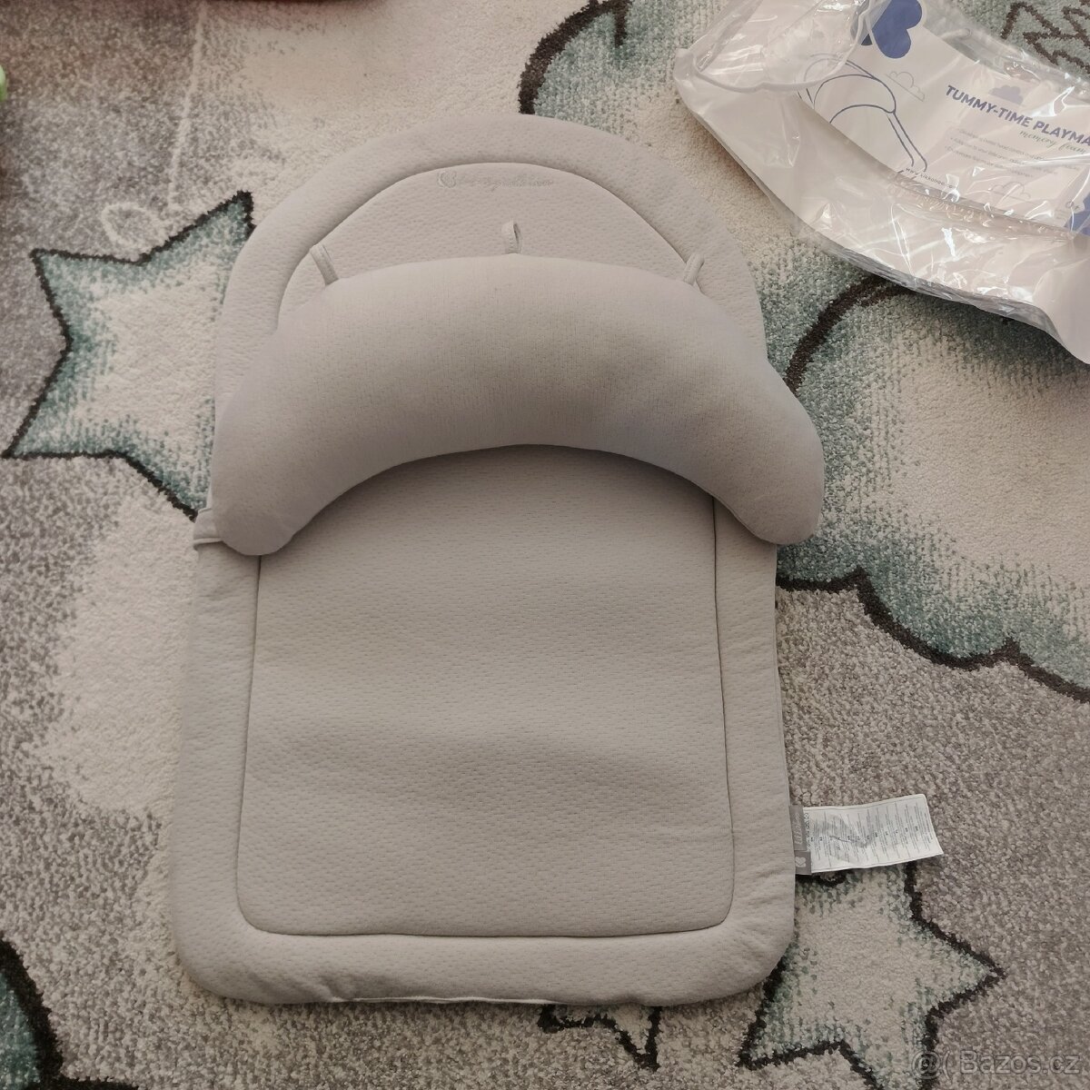 Paměťová pěna, na podporu držení hlavičky a zpevnění zádových svalů, poutka pro upevnění hračky aby dítě to zaujalo a déle vydrželo