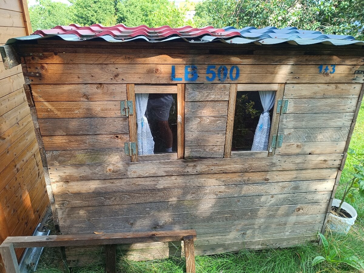 Dětský dřevěný zahradní domek. Střecha plechová. Domek je možné demontovat a měl by se vejít na vozejk. Domek je vyroben z dřevěné bedny o rozměrech : výška 165 cm, šířka 190 cm a hloubka 100 cm