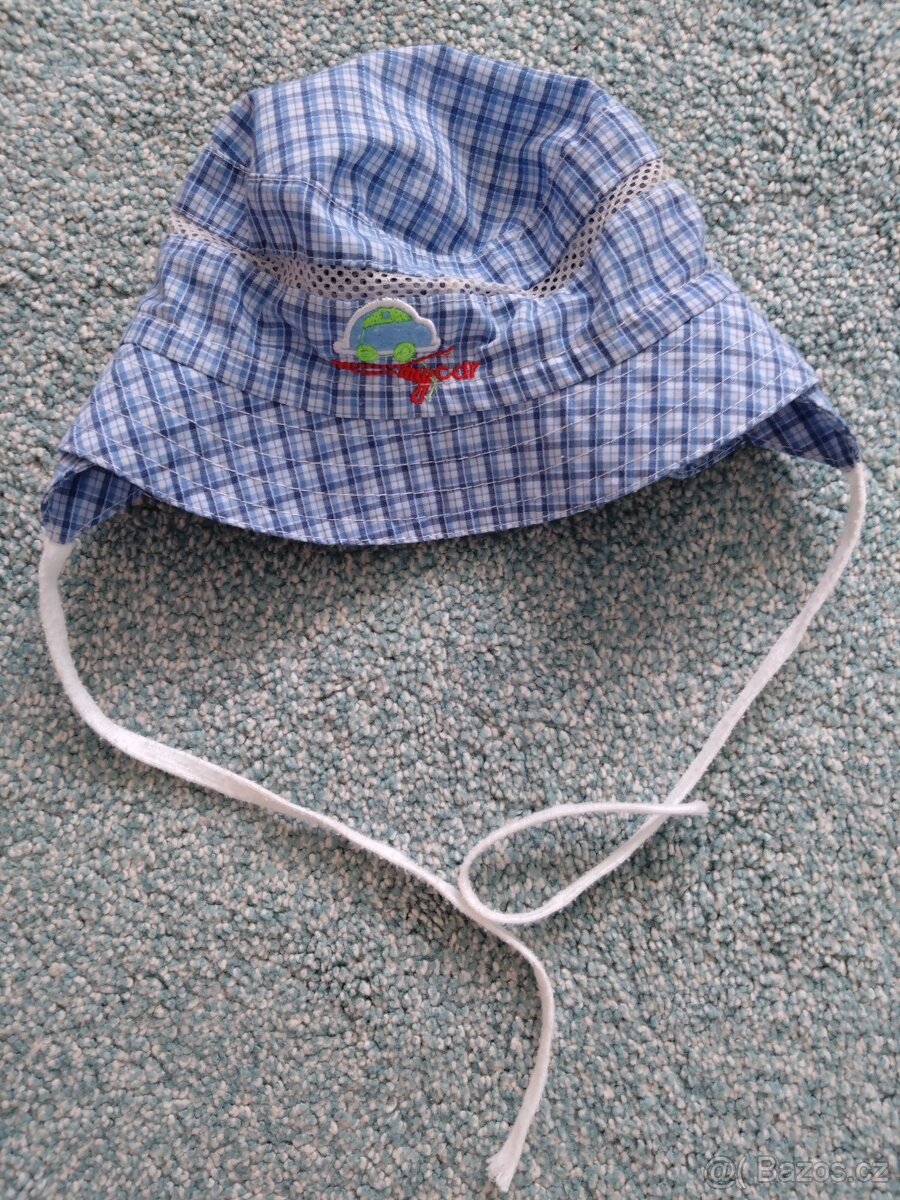 Prodám plátěný klobouček pro kluka, velikost 42-44. Po celém obvodu větrací síťka. Přes uši klapky a zavazování na tkaničky. Moc pěkný.
