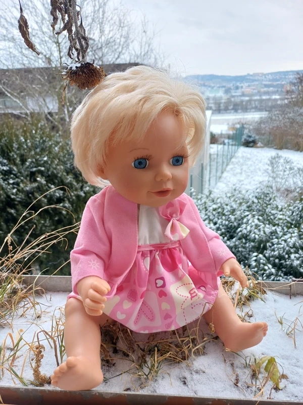 Velká cca 40 cm. Směje se, pláče, když se pohladí, udělá zvuk, když se jí člověk dotkne na puse, udělá zvuk jako když dává pusinku. Zvedá ruce a říká máma.