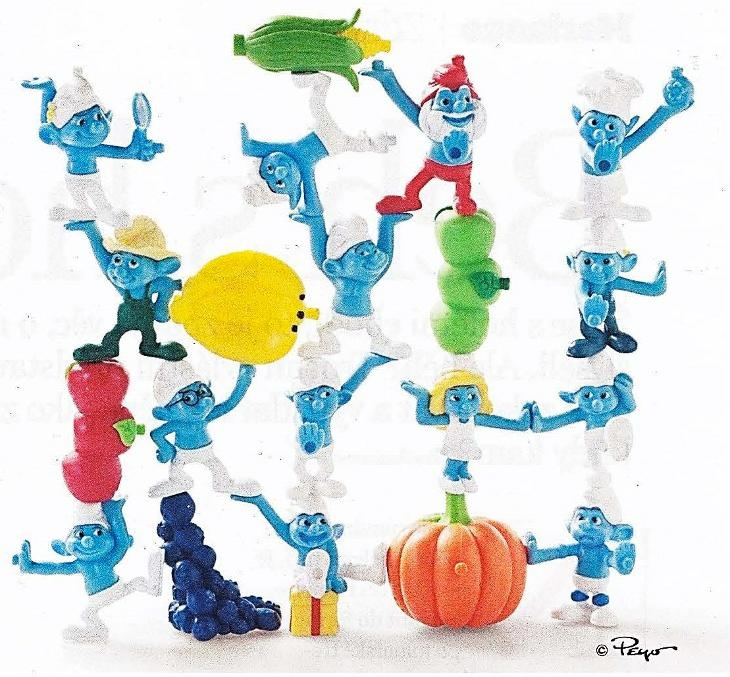 celkem 16 gumových figurek šmoulů a 6 ks ovoce a zeleniny; jednotlivé figurky se dají mezi sebou a s ovocem libovolně spojovat, takže si z nich děti mohou vytvořit kombinace podle vlastních představ; v sadě je 9 různých figurek (1 čtveřice, 4 dvojice a 4 sólo kusy) + 2 x borůvky, 2 x kukuřice, jablíčka a dýně; velikost figurek 4 cm; 10 Kč za ks; zasílám Zásilkovnou nebo Balíkovnou