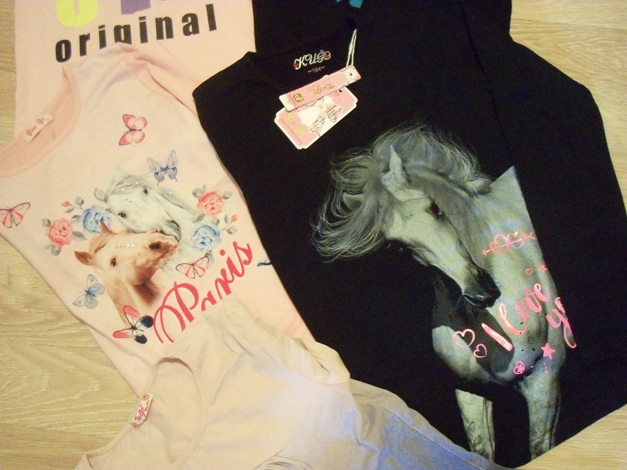 Krásná trika ve velikosti 164. Černé triko s koněm je s dlouhým rukávem ještě s cedulkou cena 200,- kč, první triko s Mickym a poslední s koněm jsou s krátkým rukávem cena 80,- kč. Triko se srdcem s dlouhým rukávem cena 70,- kč, triko s dvěma koníky s dlouhým rukávem cena 85,- kč.