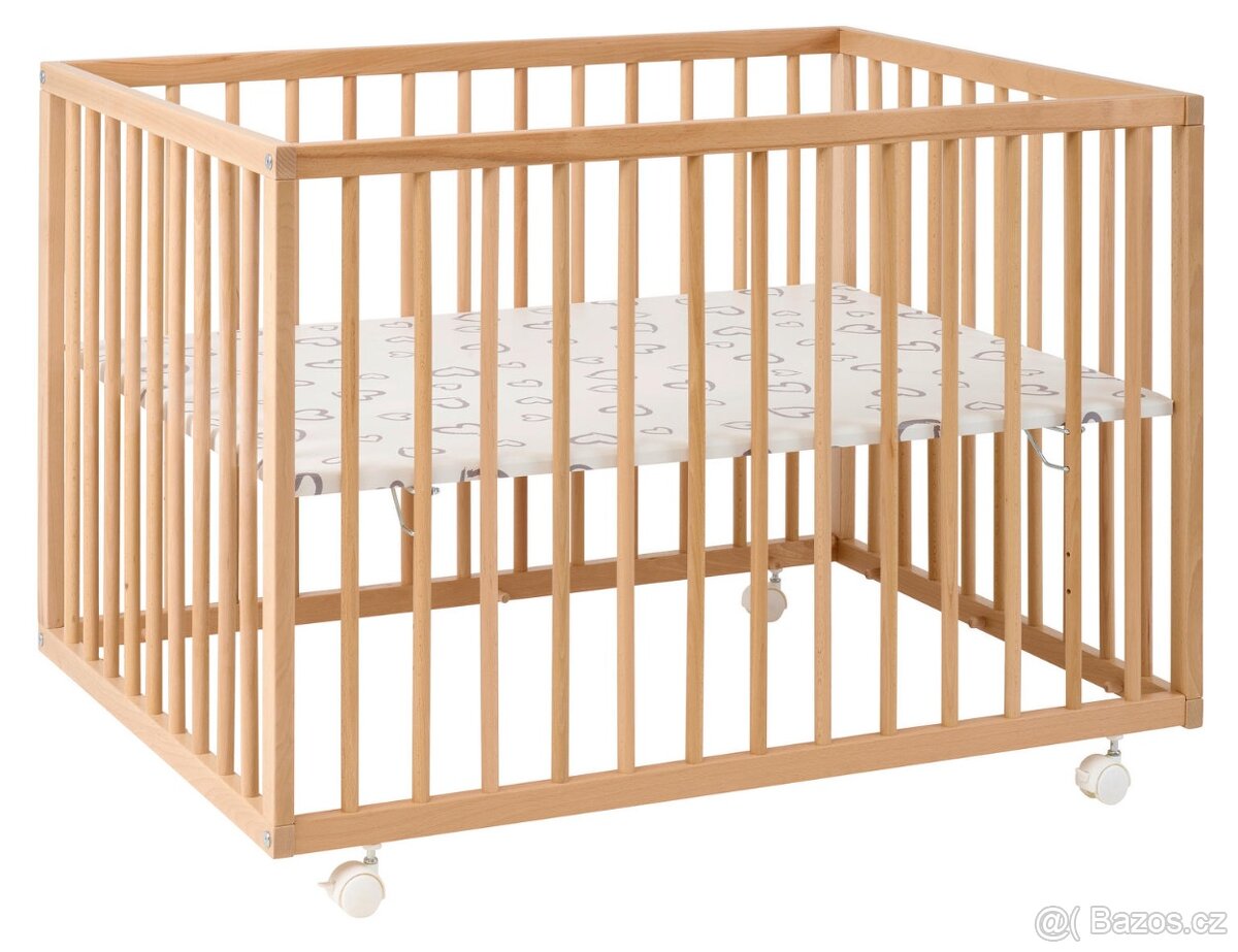 Nabízím polohovatelnou ohrádku z přírodního dřeva na kolečkách po jednom dítěti. Polstrovaná deska, možno využít i jako přebalovací pult. Součástí i mantinel, výplň do ohrádky, klínový polštář a kapsář.