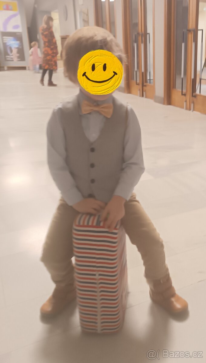 V perfektním stavu. Vhodné ke slavnostním příležitostem. Nosili jsme k tomu kožené Froddo boty, které prodávám zvlášť. Stačí doplnit motýlkem, nebo kravatou🤗Vesta má zajímavou podšívku se vzory aut a motocyklů, šla nosit i obráceně 😉