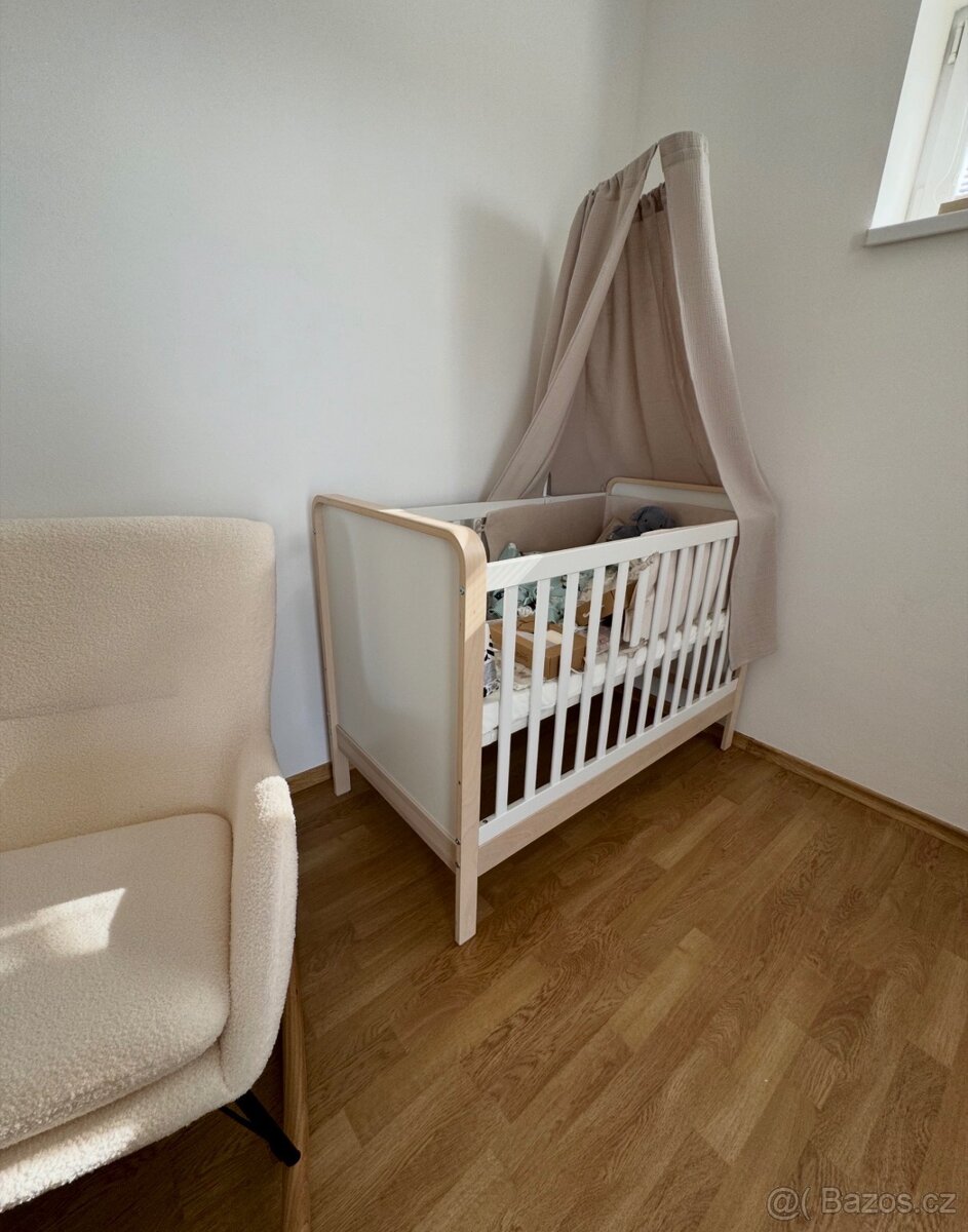 Dětská postýlka + matrace + mantinel - [16.2. 2026]Prodám cca rok a půl využívanou bílou postýlku 100x50cm se stahovacím bokem a polohovacím roštem, včetně matrace Träumeland Brise Light a prostěradla Träumeland. Dále je součástí šedý mušelínový mantinel 180x30cm od Janiky B šitý na míru. Vše jako no ...