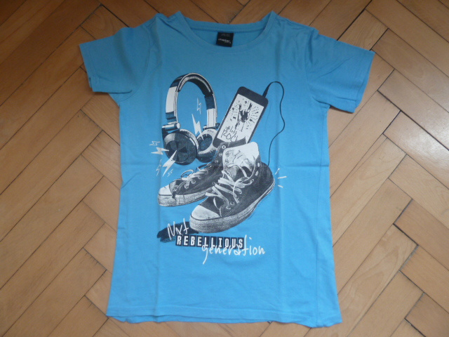 Modré tričko s krátkým rukávem, materiál 100% bavlna, dobře prací, vel. 146/152, v perfektním stavu, po jednom dítěti.