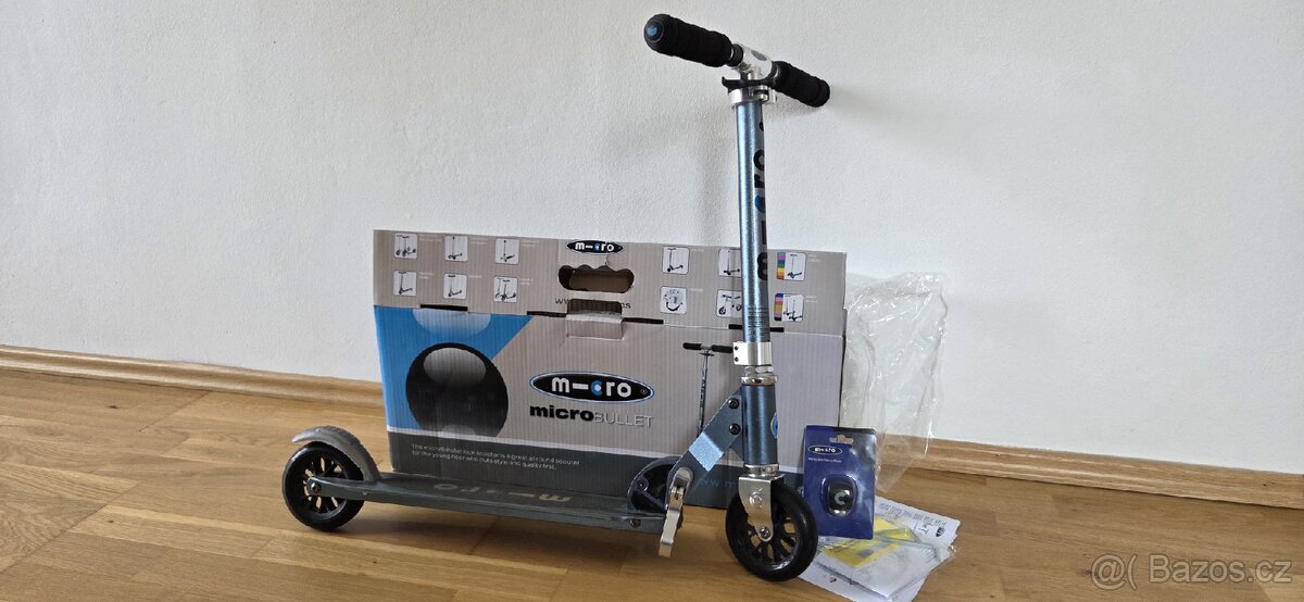 Prodám koloběžku Micro Bullet s kolečky průměr 120 mm. V originálním balení. Nevhodný dárek. Pouze vybalená a projetá po domě. Po půlroce stání v pokoji, vrácena do krabice...