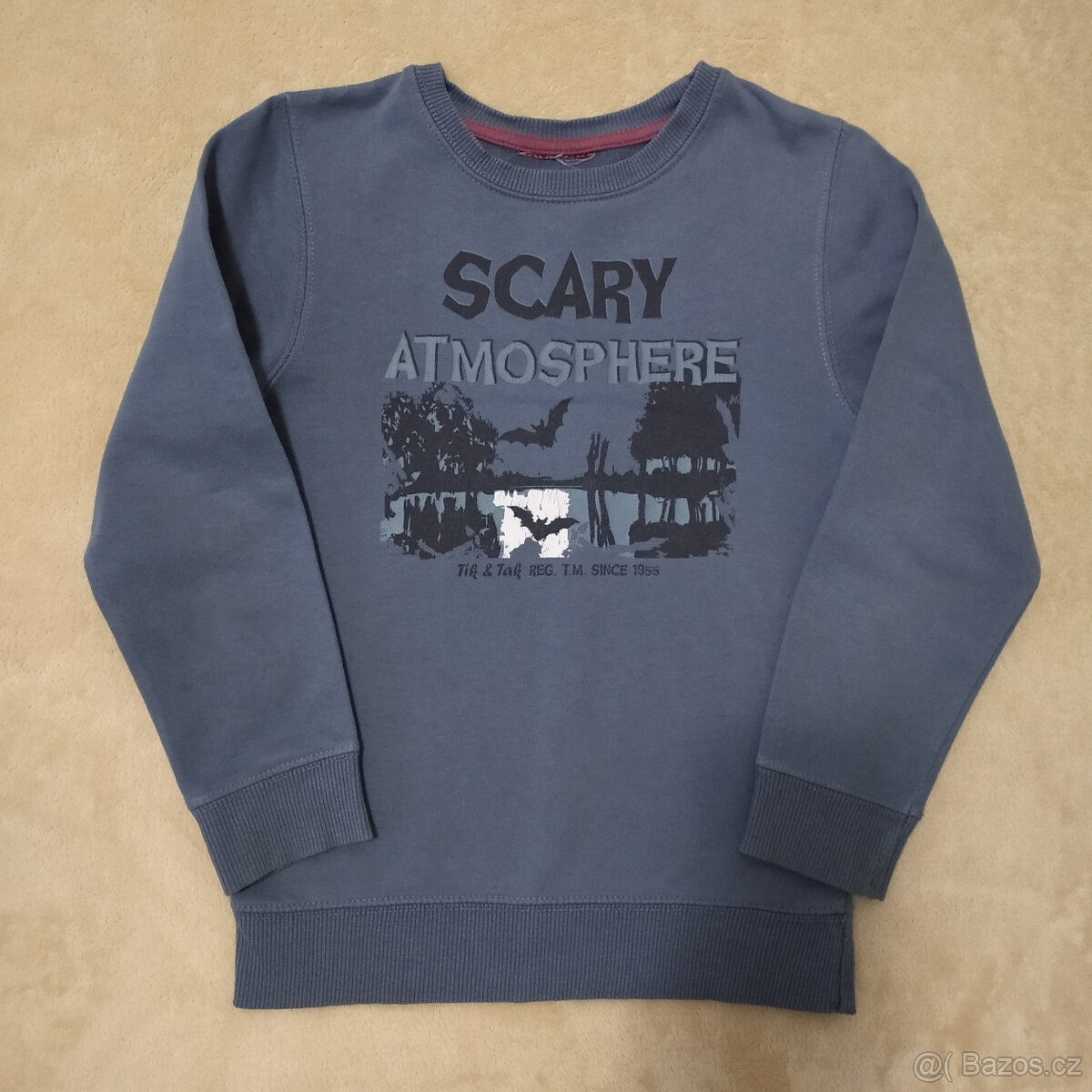 Prodám dětskou mikinu Tik & Tak SCARY ATMOSPHERE, velikost 122/128, barva šedomodrá.