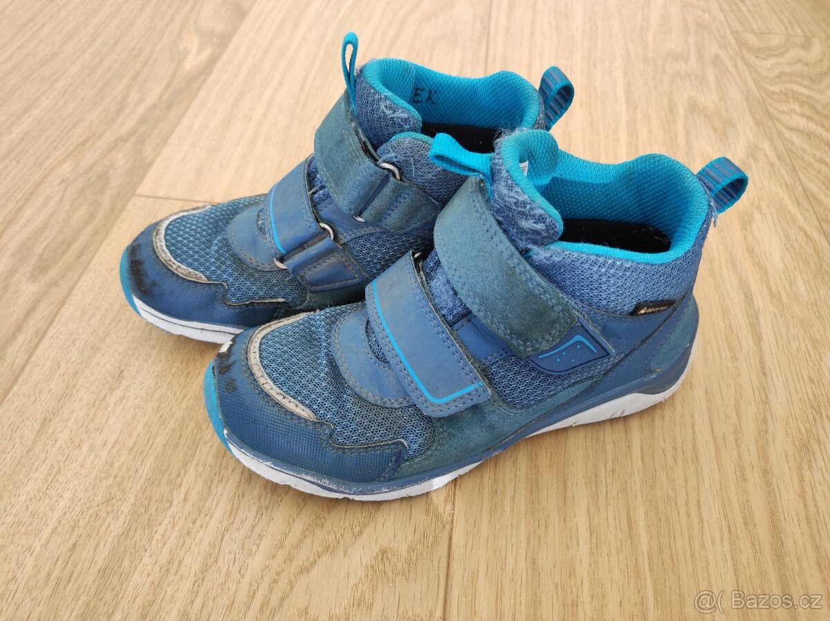 Celoroční boty Superfit, velikost 32, šíře W V. Barva modrá, kotníčkové, goretexová membrána, zapínání na suchý zip. Na špičce odřené - pouze estetická závada (viz foto). Vnitřní vyjímatelná stélka nepoužívaná (syn měl vlastní vložky do bot).