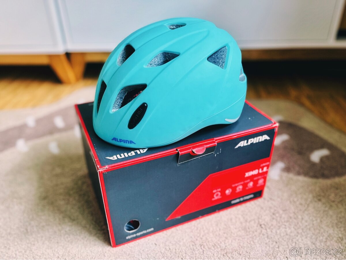 Dětská helma na kolo značky Alpina, model Ximo, barva tyrkysová s fialovými akcenty, stav dobrý - vše funkční, ale je trochu otlučená (viz foto).