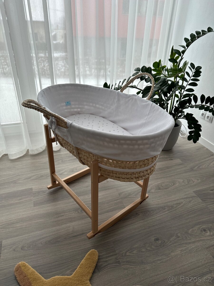 Mojzisuv kos houpací - [12.2. 2026]🤍 Mojžíšův koš s podstavou, matrací a potahem – krásný stav 🤍
