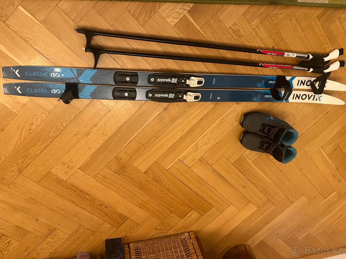 Prodám běžkařský set pro děti. Lyže Inovik Cruisis délka 129 cm se šupinami - plně funkční, mají nějaké šrámy.