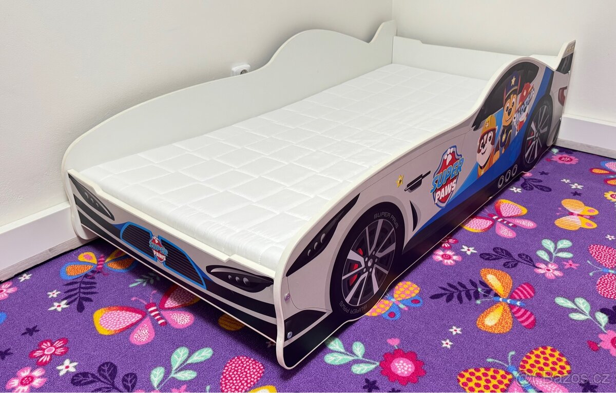 Dětská postýlka ve tvaru auta a polepy Tlapkové patroly. Včetně lamelového roštu a nové matrace 160x80.