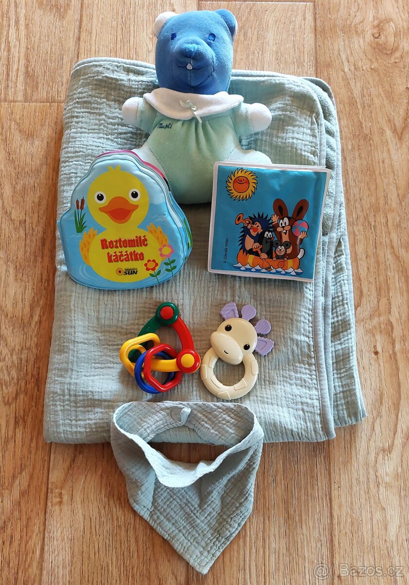 Prodám krabici věcí pro dítě, autíčko se zvuky, deka fleecová, barva hrášková nová vel. 100 x 80 cm, 2x kousátka nová, 2x plastová obrázková knížka použitá, nový bryndák nepoužitý a medvídek. Jen v celku za 200Kč. Zaslání zásilkovna, balíkovna po předchozí platbě na účet.