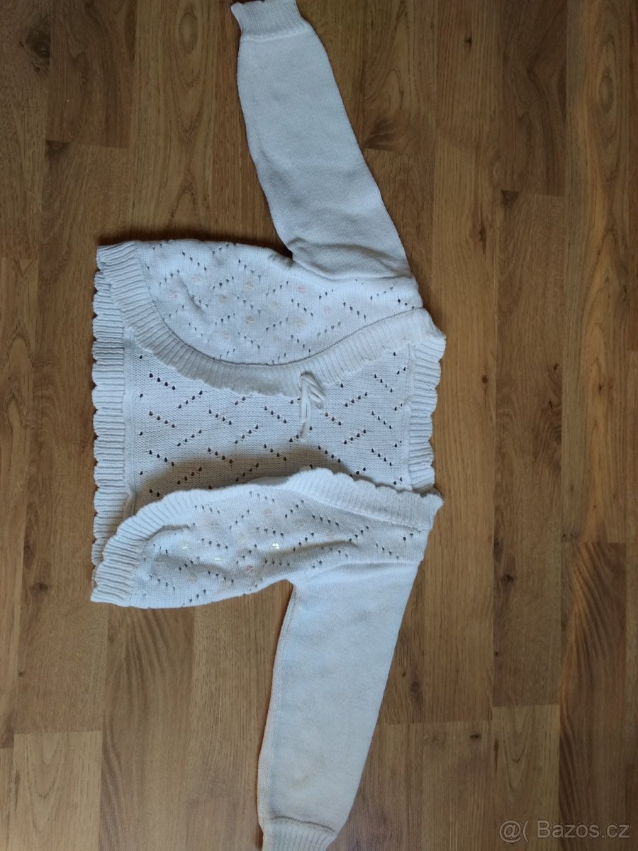 Prodám dívčí bílý svetřík, velikost 9-12 měsíců, příze, falešná mašlička, zapínání na vnitřní knoflík (viz foto).