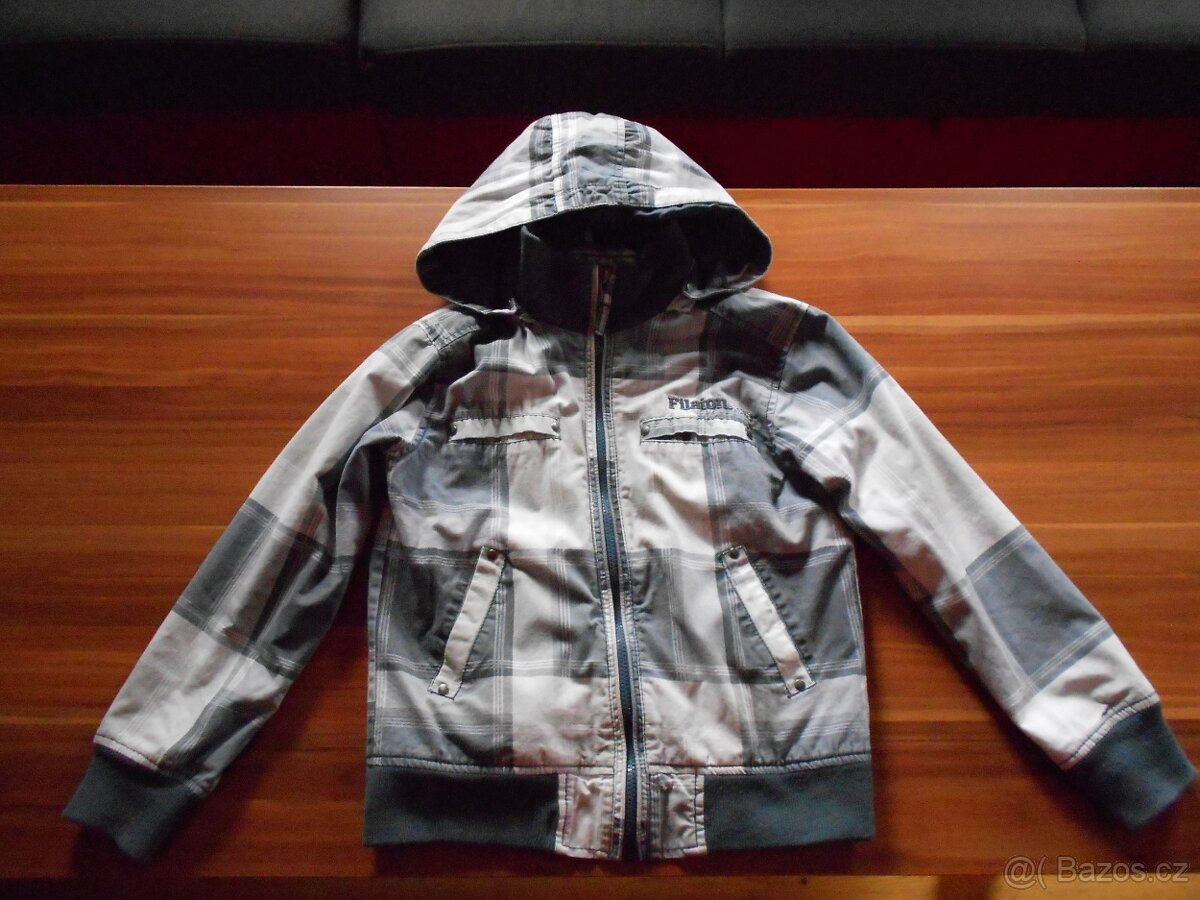 Bunda s podšívkou bílo-šedá s odepínací kapucí,vel.134-140-TAKO.Cena 90 kč.Top stav.