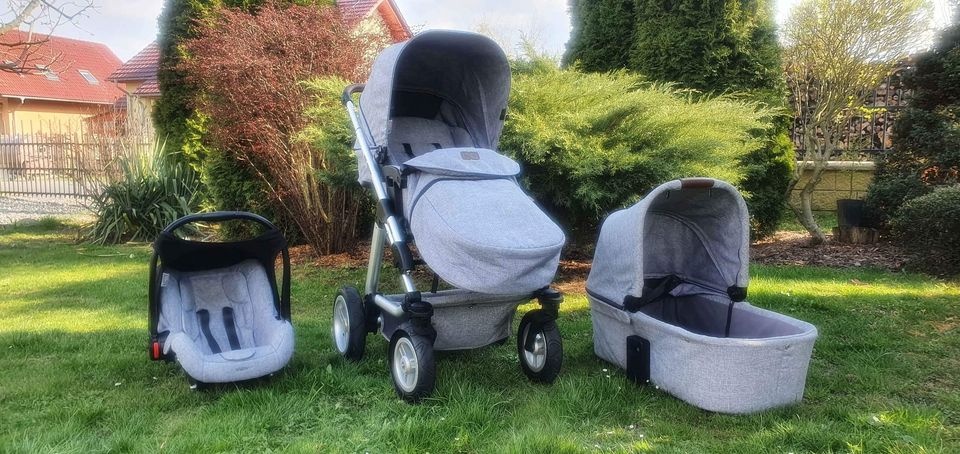 Kočárek Dada Paradiso Apus grey trojkombinace - [19.2. 2026]Trojkombinace s lepší autosedačkou Cybex Aton (nebouraná) a s redukcemi pro upevnění na kočárek. Drobné běžné opotřebení, na síťce u sportovní korbičky zašívaná malá dírka. Dvě korbičky, autosedačka, redukce, taška a moskytiéra. Kupováno 2020 za 16.0 ...