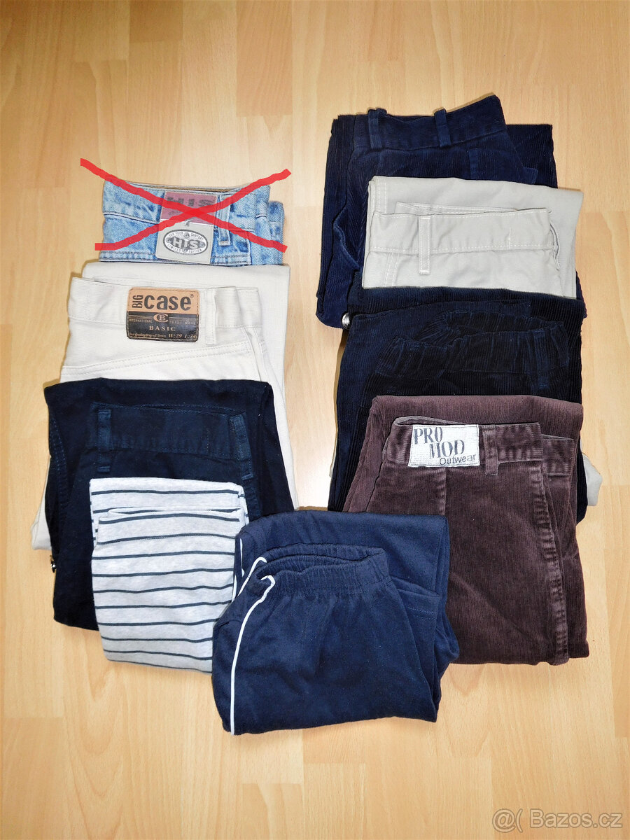 ++ béžové chl.rifle, vel.W32 L32, D 97 cm, od sedu 69,5 cm, pas 36 cm, nejsou elastické. Cena 60 Kč.
