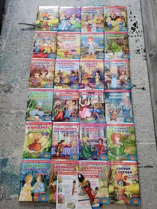 darek .Celá série kouzelné pohádky Norbert Lichý. Krásné obrázky, všechny 24 pohádky z pérem. Pero je na baterky nebo se může nabíjet přes kabel. A reguluje se hlasitost. Má vstup pro sluchátka. PC byla přes 6 tis. Vše nové, nehrano Jediná knížka cervena karkulka je na obalu trošičku poškozená (nafoceno).4 knihy prodáno, tak na prodej 20 knih i pero . Mužů prodat zvlášť kniha -150kč !!
