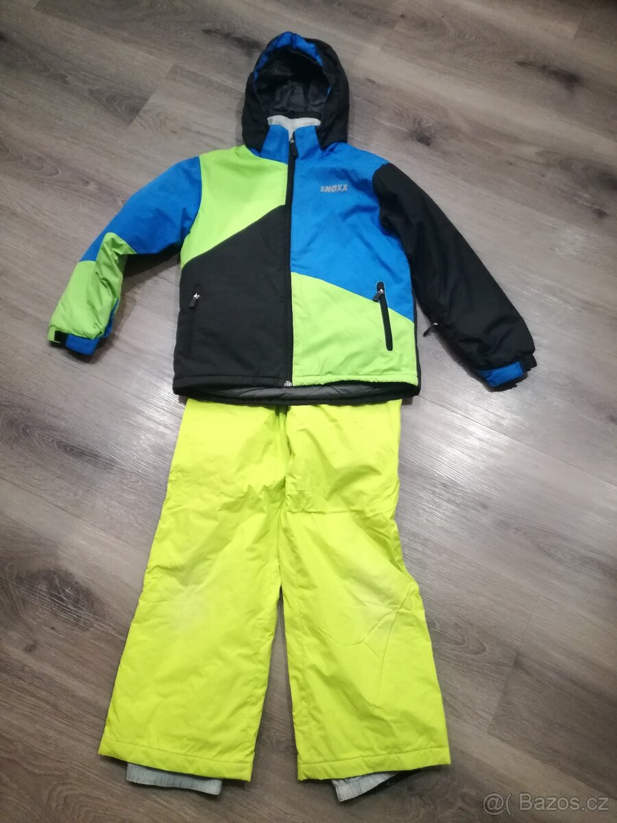 Oblíbená zimní lyžařská souprava zn. Snoxx, velmi teplá bunda černo/modré/zelené reflexní barvy s odnímatelnou kapucí, dvěma postranními kapsami a jednou kapsičkou na permanentku na levém rukávu, další tři vnitřní kapsy. Rukávy na gumu + suchý zip, sněžný pás. Vodní sloupec 3000mm, prodyšnost 3000g/m2/den.