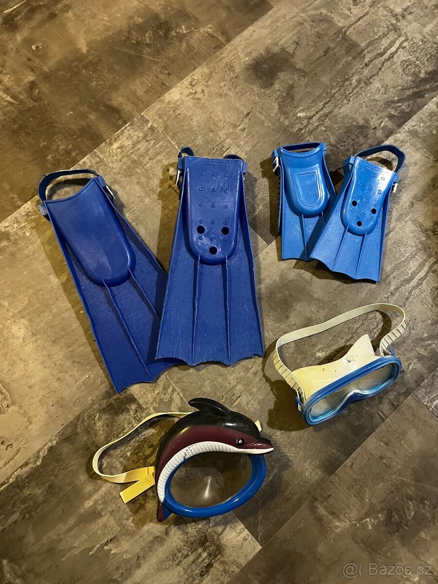 Prodám dětské ploutve a brýle na plavání, či potápění, dvě velikosti. Cena za vše.